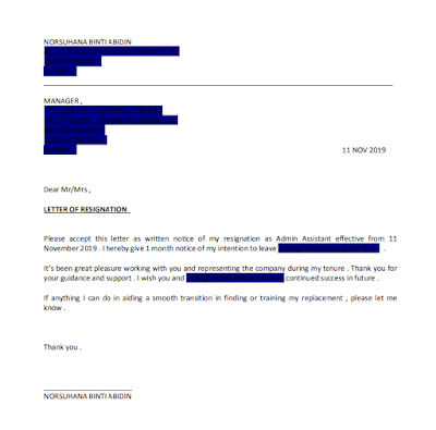 It is my first time ever jump career . I'm not the kind of person who likes to jump around . With some reason , i have to . Alhamdulillah , the transition is going smooth . I got a new job . Yeahhhh ! Massive thanks to my friend who recommend me this new job . I've sending a resign letter with 1 month notice to my manager yesterday and she didn't offer any increment as she know my new job is offering a higher salary than now .